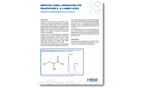 In this application note, we present separation of the D- and L-isomers of two neurophysiologically relevant amino acids, Serine and Glutamic Acid, by high pressure liquid chromatography (HPLC) using the ChiroSil chiral stationary phase.