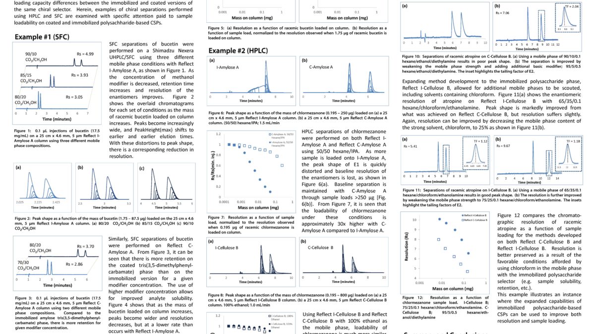Chiral stationary phases (CSPs) prepared by coating phenylcarbamate derivatives of amylose and cellulose on supporting silica gels have proven invaluable for the separation and purification of enantiomers. One limitation of coated phases is the restricted use of certain organic mobile phases, such as acetone, chloroform, ethyl acetate, THF, and toluene. Immobilized versions have expanded the capabilities of these phases to allow for use of such solvents, though, in some cases, practitioners have observed selectivity and loading capacity differences between the immobilized and coated versions of the same chiral selector. Herein, examples of chiral separations performed using HPLC and SFC are examined with specific attention paid to sample loadability on coated and immobilized polysachharide-based CSPs. Download |