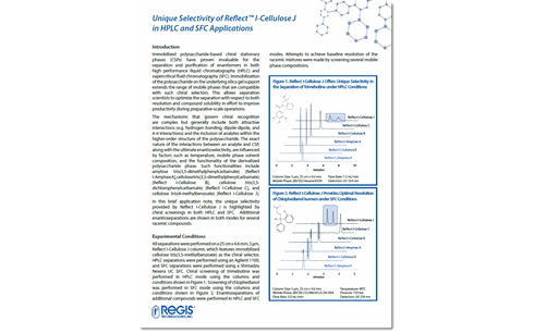 In this note, we highlight the unique selectivity of Reflect I-Cellulose J with chiral screenings in both HPLC and SFC. Additional enantioseparations are shown in both modes for several racemic compounds.